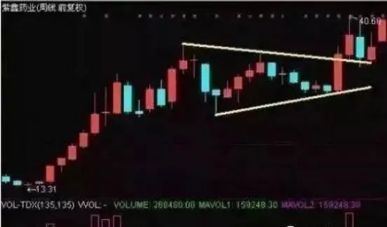 上面这2幅周线图,将之前的大升势定义为“旗杆”,以后进行的是“旗面整理”或称之为“上升三角形整理”。而且从收盘价线图上看,是那么的完美经典。